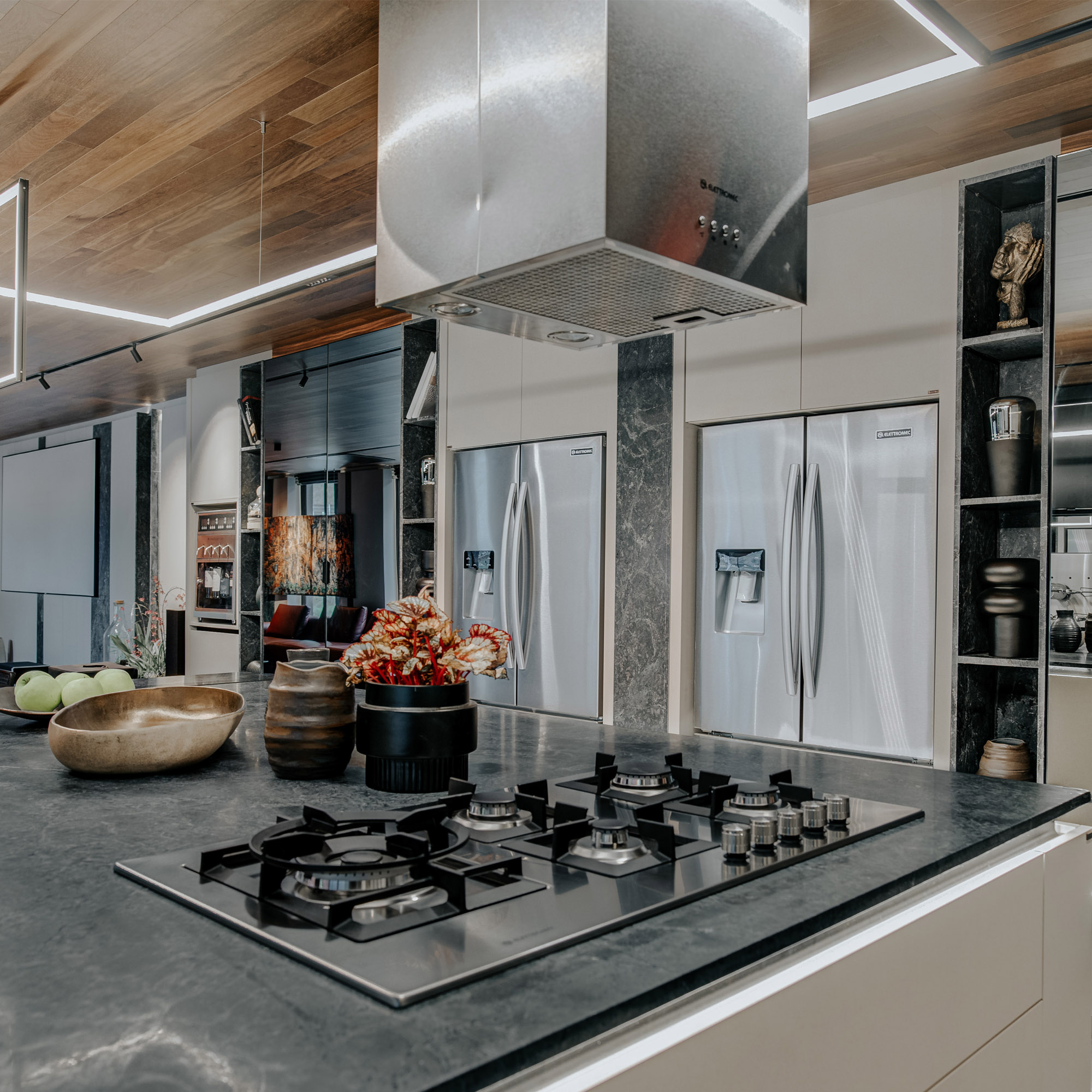 Mais uma coifa com design diferenciado e exclusivo Eletromec, a Proteus foi desenvolvida com longas placas de aço inox, em linhas retas, e finos detalhes no comando soft touch. É clean e traz requinte ao seu espaço goourmet.