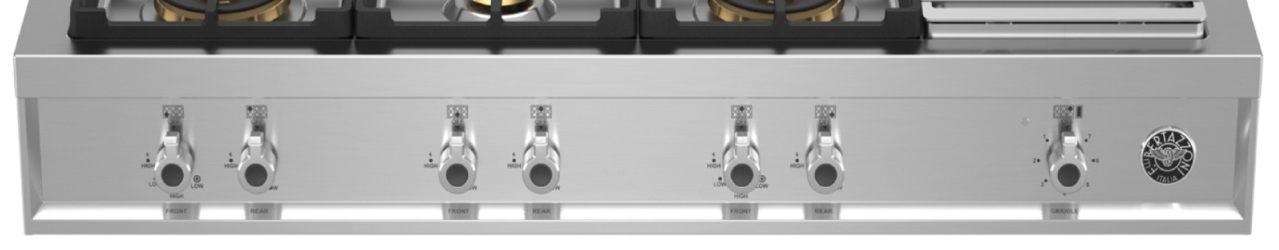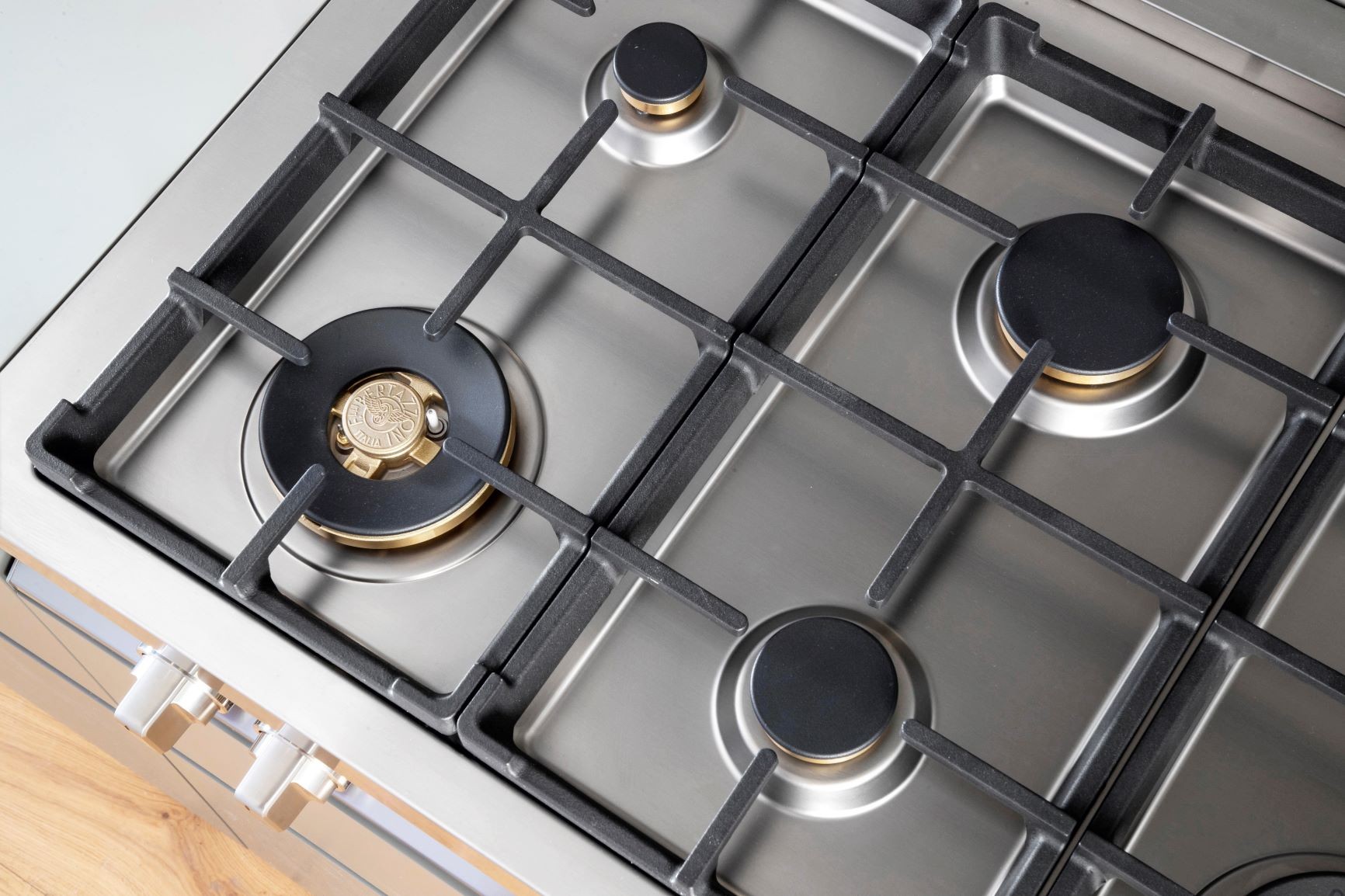 Queimadores profissionais em latão, elegante design com manípulos em metal maciço e robustas trempes em ferro gusa compõem este imponente rangetop Bertazzoni made in Italy, marca com experiência de mais de 130 anos na fabricação de eletrodomésticos premium.